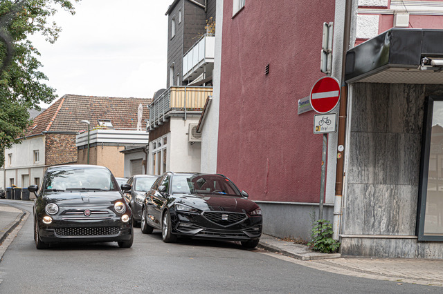 Schließlich gestaltet sich die Situation in der Marienstraße herausfordernd. Diese Straße darf von der Erzbergstraße aus von Radfahrenden entgegen der Einbahnstraßenregelung in Richtung Graf-Adolf-Straße befahren werden. Abbildung 4 verdeutlicht, dass der Raum zwischen parkenden und fahrenden Fahrzeugen begrenzt ist. Im dargestellten Fall handelt es sich beim entgegenkommenden Auto um ein kleines Modell (Fiat 500); bei größeren Fahrzeugen wäre der zur Verfügung stehende Verkehrsraum entsprechend noch eingeschränkter. Radfahrenden ist hier nicht zu empfehlen, die Straße entgegen der Fahrtrichtung zu nutzen – die Freigabe für Radfahrende macht hier derzeit wenig Sinn.
