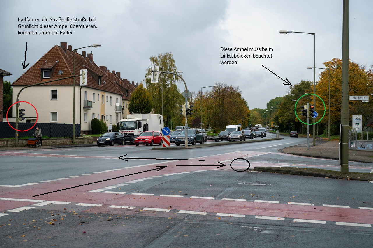 Besonders irritierend: Eine Radfahrerampel auf der gegenüberliegenden Straßenseite zeigt ein grünes Fahrradsymbol– doch wer diesem Signal folgt, begibt sich in Lebensgefahr. Tatsächlich gilt hier zunächst die Fahrzeugampel, erst danach die Ampel für Radfahrer. Der kleine Linkspfeil unter dem grünen Fahrradsymbol auf der gegenüberliegenden Seite wird auf den ersten Blick nicht wahrgenommen.